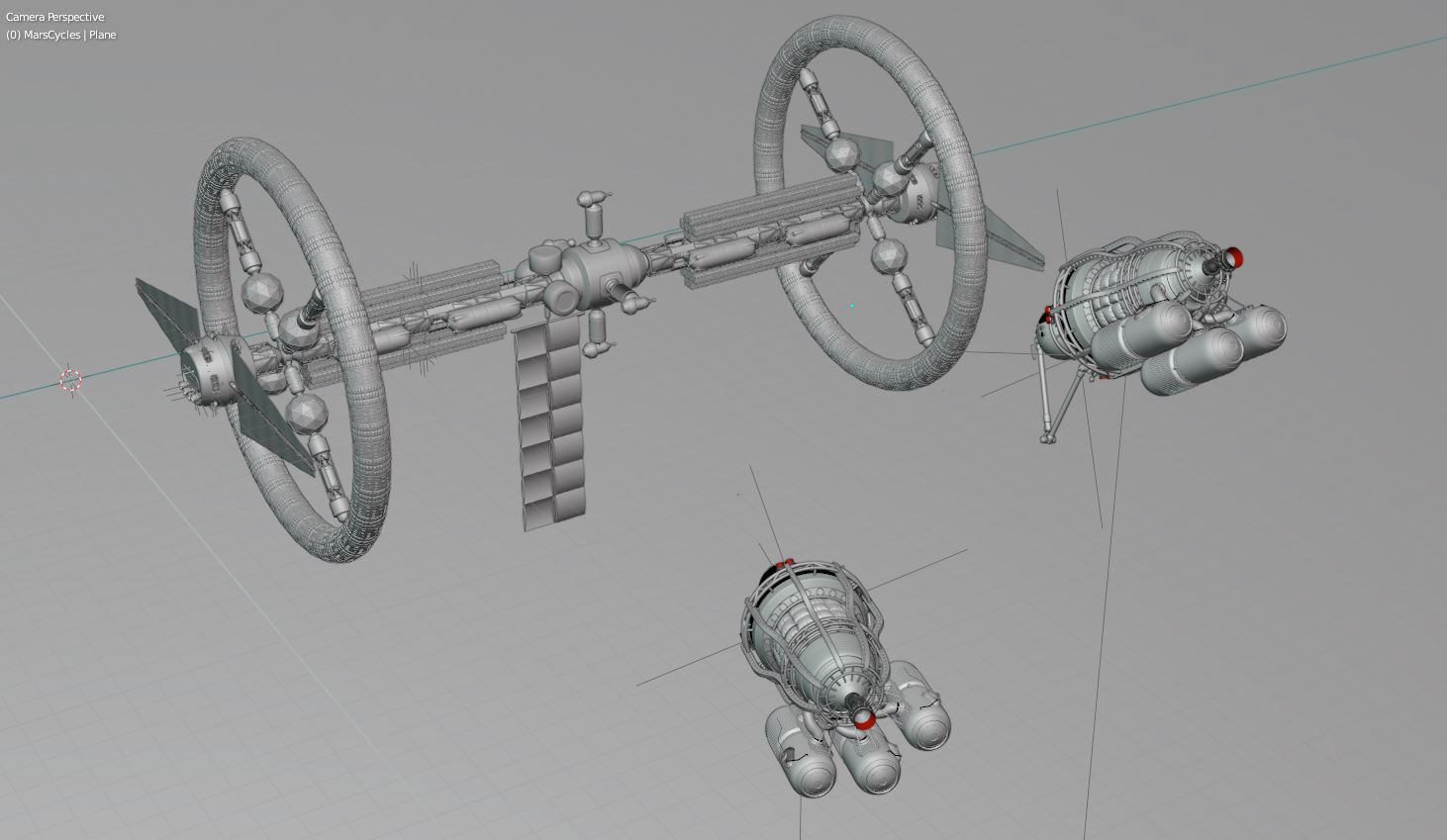 Mars migration vehicle EEVEE-1 arrives to Mars orbit, December 25, 2107. Two "Gunther" class O.S.T's approach for cargo inspection. The historic moment captured by a passenger on a transport ship en-route to Kasal station. ... ... ... /// Archived image.